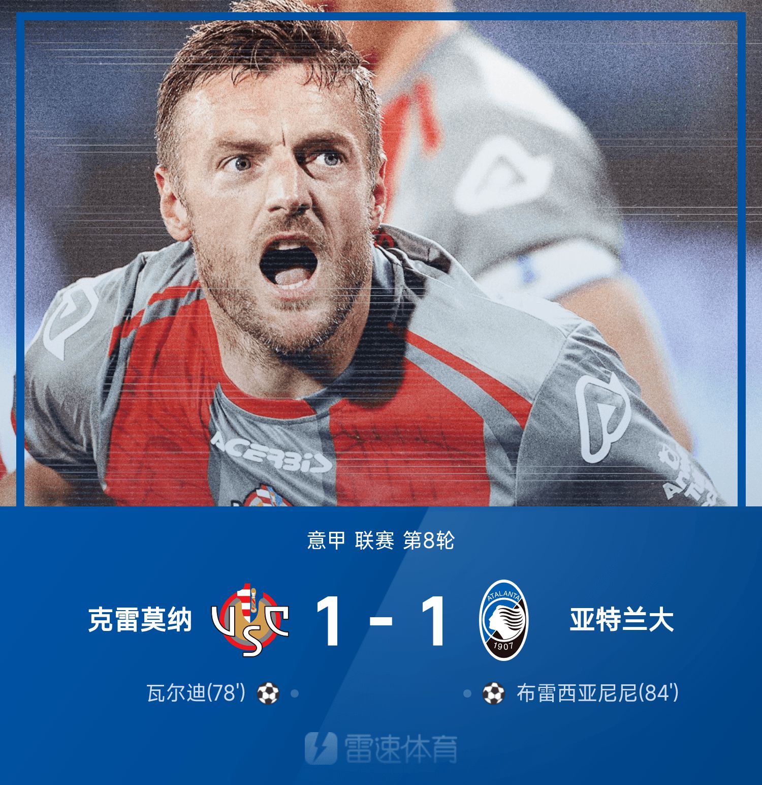 6686 Sports 26 октября В 8-м туре сезона 25/26 Серии А «Кремона» сыграла вничью с «Атлантой» со счетом 1:1. На 78-й минуте второго тайма Варди последовал за ним и забил, забив свой первый гол в карьере в Серии А и помог Кремоне выйти вперед. На 84-й минуте Брешианини забил гол, помог «Атланте» сравнять счет и отобрать очко у гостей.